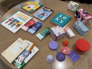 ※右の写真は、お土産の品々。月経カップや避妊薬など。